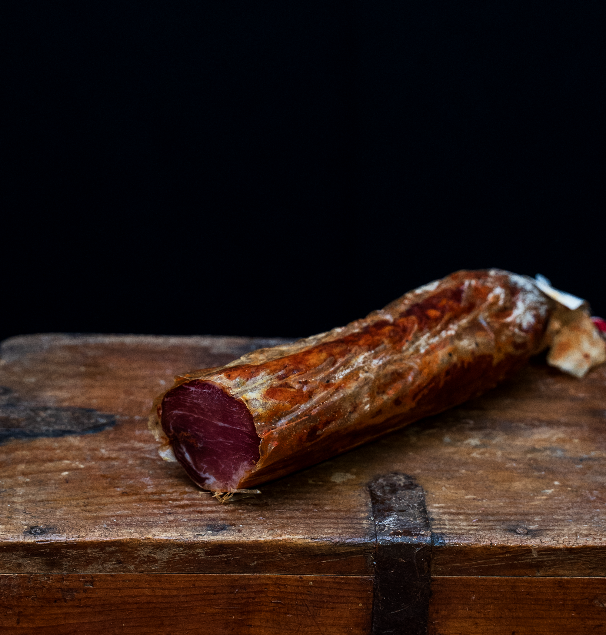 Proviene de la presa, considerada como una de las piezas más nobles del cerdo ibérico, tiene una textura y aroma suaves, presentando al corte las características de vetas de grasa infiltrada, derivadas de su calidad y de la alimentación basada en Bellotas. Macerado de forma tradicional y aderezado con sal, pimentón y especias naturales durante un proceso de maduración de 4 meses. Es uno de nuestros embutidos estrella con el que acertarás.