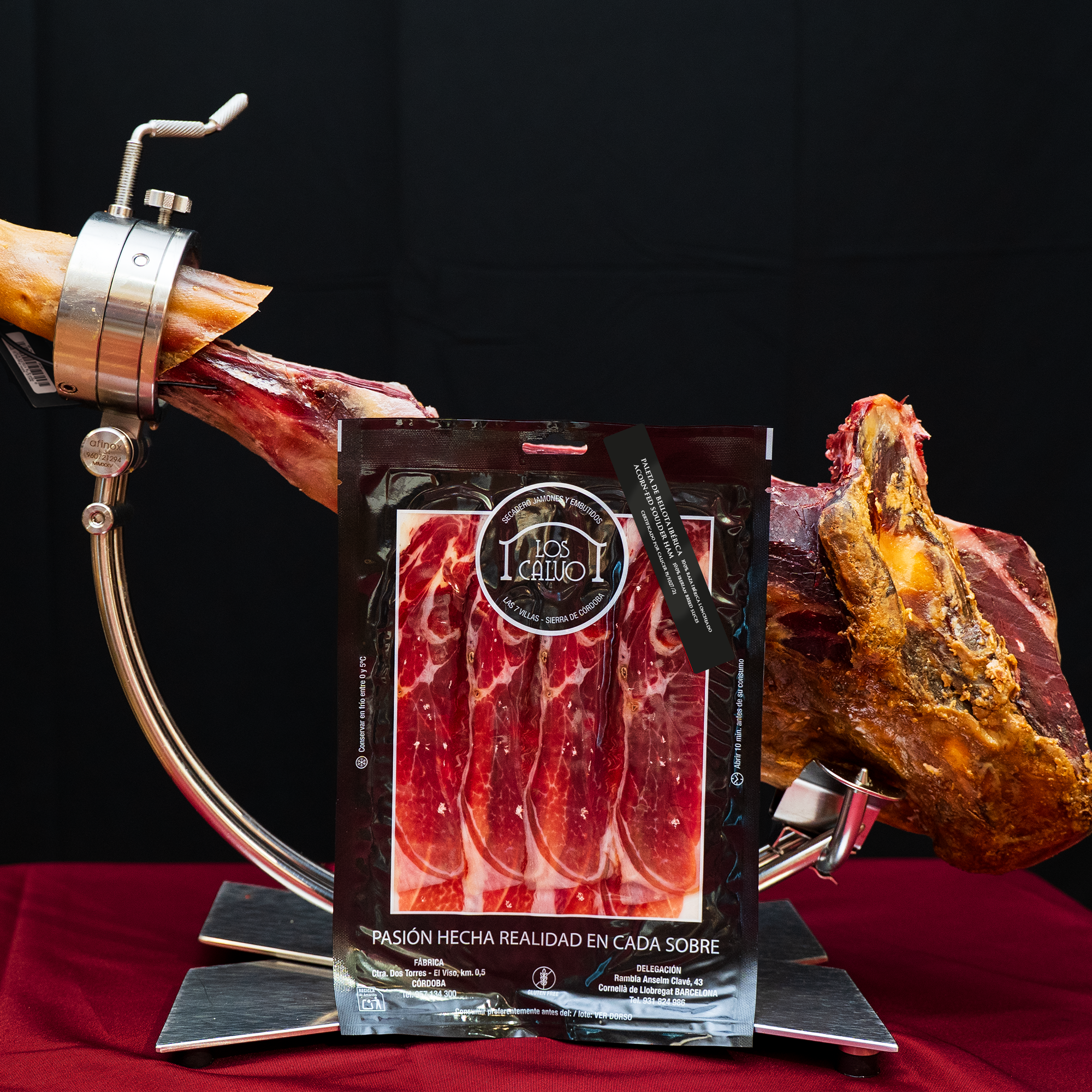 Carne roja con vetas de grasa blanca-nacarada. La carne del Jamón de bellota 100% ibérico tiene sabor delicado, poco salado y exquisito en boca. Tiene un aroma agradable y característico, un aroma único. Textura homogénea, poco fibrosa y sin pastosidad ni reblandecimiento.