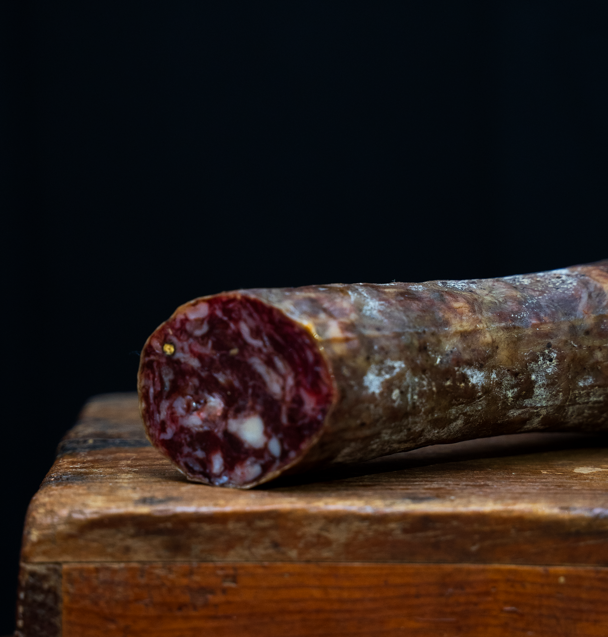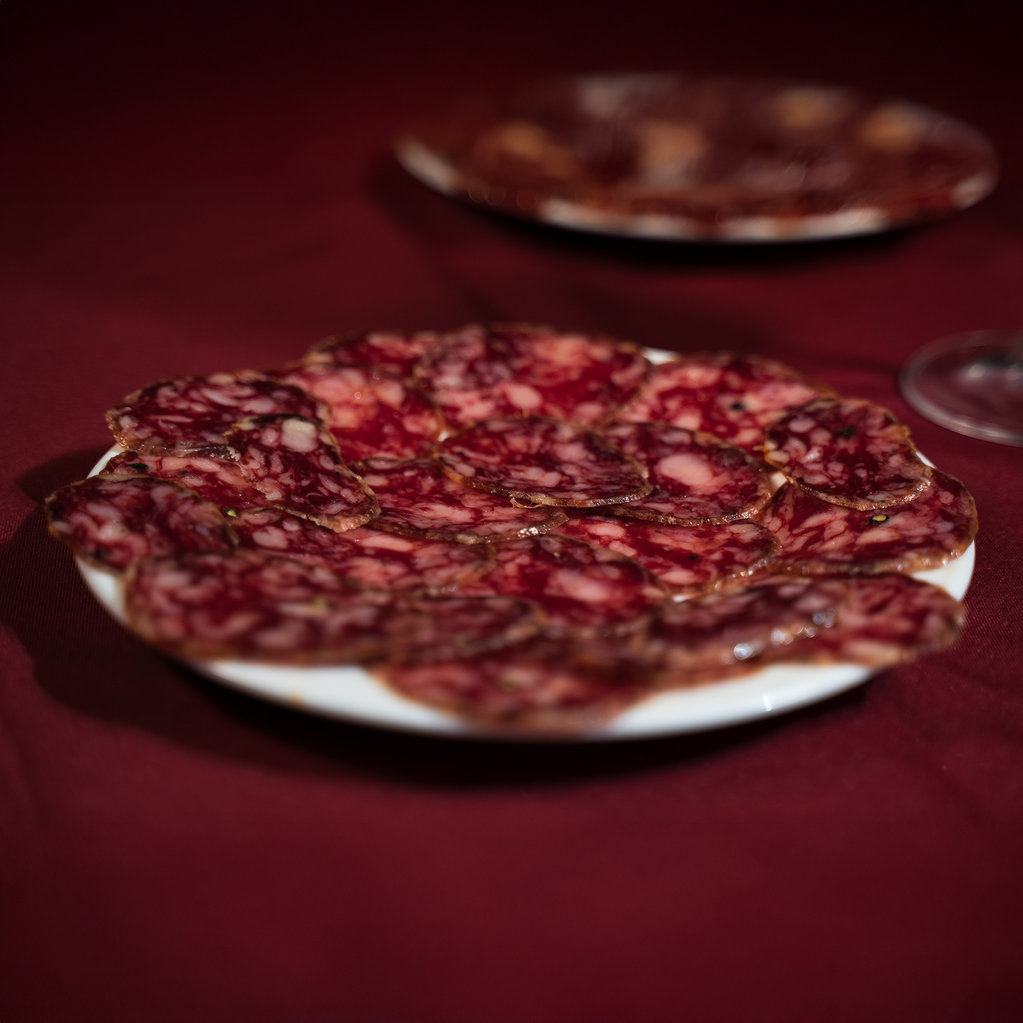 Embutidos seleccionados rigurosamente, aderezados con especias naturales y pimienta negra en grano, lo cual le confiere al producto un sabor exquisito. Obtenido de carnes procedentes de un cerdo criado en libertad y alimentado con bellotas.